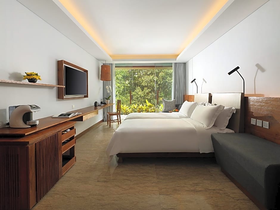 Believe the math: one corner equals two capacious balconies. Admire the lush vegetation in the sanctuary from your expansive guestroom, adorned with Bali’s creative traditions.